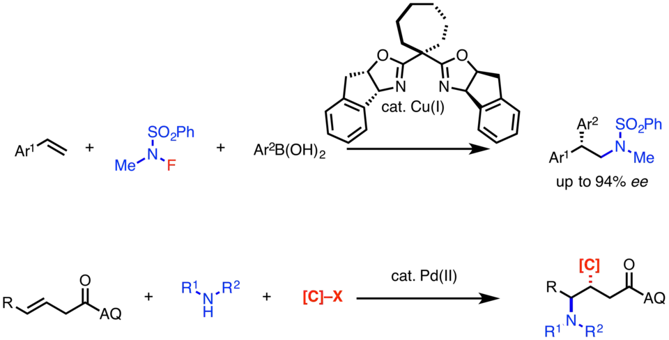- ↑ Liu, Z.; Wang, Y.; Wang, Z.; Zeng, T.; Liu, P.; Engle, K. (2017). "Catalytic Intermolecular Carboamination of Unactivated Alkenes via Directed Aminopalladation". J. Am. Chem. Soc. 139 (32): 11261–11270. doi:10.1021/jacs.7b06520. PMID 28727452.