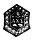 The fraternity's badge is hexagon-shaped, symbolizing the basic structural symbol for aromatic compounds.[3] It features the Greek letters ΑΧΣ, with shaking hands below and a skull and cross bones and two stars above.[3] There is also a hexagon-shaped pledge pin with the symbol for lead (see the table below).[3] Its professional charm is a slightly larger version of the badge.[3] There is also a recognition pin for professional members that consists of a monogram of the Greek letters ΑΧΣ.[3]