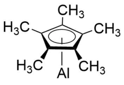 AlCp*, consisting of aluminium (I) bonded with the pentamethylcyclopentadiene anion ((CCH3)5−), was first synthesized in 1991 by Dohmier et al.[12] (AlCp*)4, a yellow crystalline solid, is first produced from the combination of AlCl and MgCp*2.[6] When vaporized, the long Al-Al bonds (276.9 pm)[12] split, and monomeric molecules of [AlCp*] are created.