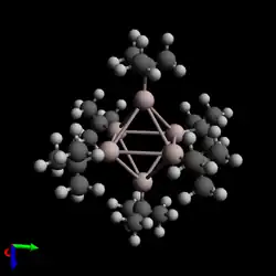 This method of cluster formation created the only known incidence of an octahedral aluminium cluster, [Al6(tBu)6]−, which was formed by reaction between AlCl and tBuLi.[6] Similarly, AlCl and LiN(SiMe3)2 react to form the first known example of a cluster where two M4 tetrahedra are connected by a common center.[6]
