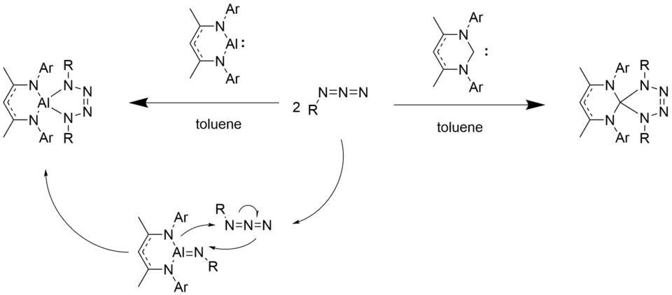 Similarly to the nucleophilic carbon center in the carbene, the lone pair on the aluminium center binds to the first azide equivalent. Nitrogen gas is liberated. With the second equivalent of azide, a five-member ring is formed.