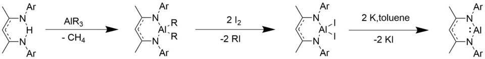 β-diketiminato aluminium alkyls and aluminium halides are synthesized by adding a trialkyl aluminium compound to the initial β-diketiminate ligands, adding iodine, and the reducing with potassium.[10]