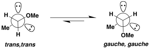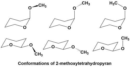 An example of this is 2-methoxytetrahydropyran. As the anomeric effect predicts, the methoxy substituent shows an increased preference for the axial conformation. However, there is actually more than one possible axial conformation due to rotation about the C-O bond between the methoxy substituent and the ring. When one applies the principles of the reverse anomeric effect, it can be predicted that the gauche conformer is preferred, suggesting the top left conformation is best in the figure above. This prediction is supported by experimental evidence. Furthermore, this preference for the gauche position is still seen in the equatorial conformation.[15]