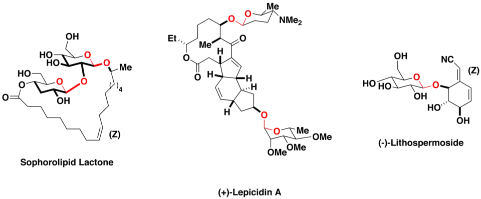 The anomeric effect is taken into consideration synthetically. Due to its discovery in sugars, sugar and carbohydrate chemistry is one of the more common synthetic uses of the anomeric effect. For instance, the Koenigs-Knorr glycosidation installs an α-OR or β-OR group in high diastereoselectivity which is effected by the anomeric effect. Sophorolipid lactone, (+)-Lepicidin A, and (−)-Lithospermoside are a few of the products synthesized via the Koenigs-Knorr Glycosidation overcoming the anomeric effect.[20]