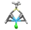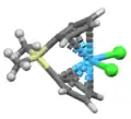 An ansa-metallocene is a type of organometallic compound containing two cyclopentadienyl ligands that are linked by a bridging group such that both cyclopentadienyl groups are bound to the same metal. The link prevents rotation of the cyclopentadienyl ligand and often modifies the structure and reactivity of the metal center. Some ansa-metallocenes are active in Ziegler-Natta catalysis, although none are used commercially.[1] The term ansa-metallocene (ansa being Greek for "handle") was coined by Lüttringhaus and Kullick to describe alkylidene-bridged ferrocenes, which were developed in the 1950s.[2]