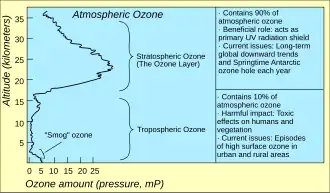 Many elastomers are rich in unsaturated double bonds, which can react with ozone present in the air in process known as ozonolysis. This reaction breaks the polymer chains, degrading the mechanical properties of the material. The most obvious effect of this is cracking of the elastomer (ozone cracking), which is exacerbated by mechanical stress. The rate of degradation is effected both by the chemical structure of the elastomer and the amount of ozone in the environment. Elastomers which are rich in double bonds, such as natural rubber, polybutadiene, styrene-butadiene rubber and nitrile rubber are the most sensitive to degradation,[1] whereas butyl rubber, polychloroprene, EPDM and Viton are more resistant. Ground-level ozone is naturally present, but it is also a product of smog and thus degradation is faster in areas of high air pollution. All of these factors make vehicle tires particularly vulnerable, as they contain a high level of unsaturated groups, operate in areas prone to air pollution and are subjected to significant mechanical stresses.