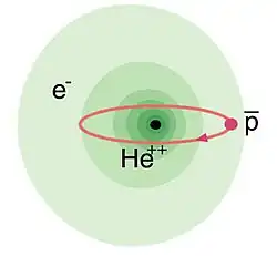 Antiprotonic helium is a three-body atom composed of an antiproton and an electron orbiting around a helium nucleus. It is thus made partly of matter, and partly of antimatter. The atom is electrically neutral, since an electron and an antiproton each have a charge of −1 e, whereas a helium nucleus has a charge of +2 e. It has the longest lifetime of any experimentally produced matter–antimatter bound state.[1]