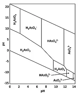 A Pourbaix diagram shows the combined influence of pH and pe on arsenate speciation.
