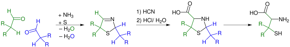 A simplified route of the Asinger-reaction was developed at Degussa. An α-halogenated carbonyl compound reacts with sodium hydrosulfide (NaSH) and forms a thiol in situ which reacts directly with aldehydes or ketones and ammonia to 3-thiazolines.[4] The chemical industry developed based on the Asinger-reaction multi stage processes for the production of pharmaceuticals like D-penicillamine[5] and the aminoacid DL-cysteine.[6]