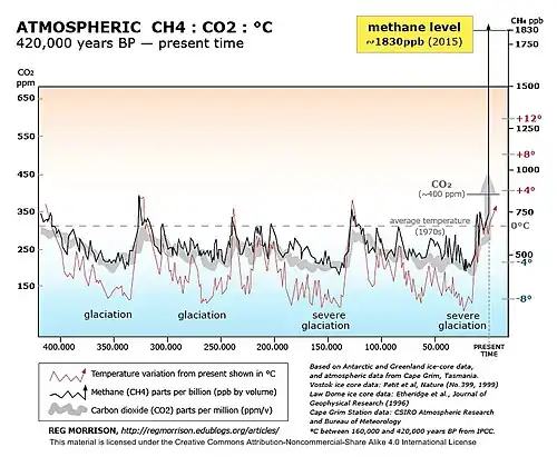 This 2016 EPA illustration above is a compilation of paleoclimatology showing methane concentrations over time based on analysis of gas bubbles from[80] EPICA Dome C, Antarctica—approximately 797,446 BCE to 1937 CE,[81] Law Dome, Antarctica—approximately 1008 CE to 1980 CE[82] Cape Grim, Australia—1985 CE to 2015 CE[83] Mauna Loa, Hawaii—1984 CE to 2015 CE[84] and Shetland Islands, Scotland: 1993 CE to 2001 CE[85]