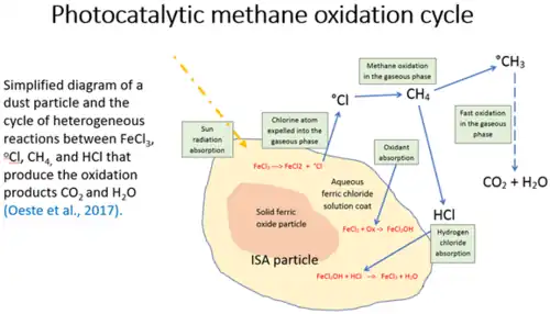 Iron salt aerosols (ISA) are one proposed method of enhanced atmospheric methane oxidation which involves lofting iron-based particles into the atmosphere (e.g. from planes or ships) to enhance atmospheric chlorine radicals, a natural methane sink.[5] Winds over the Sahara raise dust into the troposphere and disperse it over the Atlantic, supplying the atmosphere with particulate matter consisting of iron-based particles. A study done in 2023 suggests that this has contributed to natural atmospheric methane oxidation. This method has yet to be tested in a field setting, but a variety of research studies have been performed involving ISA. Research methods have been conducted by laboratory experiments, observational analysis, and numerical modeling to evaluate the potential impact of ISAs.[5]