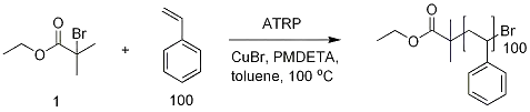 ATRP enables the polymerization of a wide variety of monomers with different chemical functionalities, proving to be more tolerant of these functionalities than ionic polymerizations. It provides increased control of molecular weight, molecular architecture and polymer composition while maintaining a low polydispersity (1.05-1.2). The halogen remaining at the end of the polymer chain after polymerization allows for facile post-polymerization chain-end modification into different reactive functional groups. The use of multi-functional initiators facilitates the synthesis of lower-arm star polymers and telechelic polymers. External visible light stimulation ATRP has a high responding speed and excellent functional group tolerance.[21]