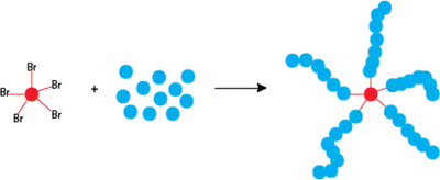 The number of growing polymer chains is determined by the initiator. To ensure a low polydispersity and a controlled polymerization, the rate of initiation must be as fast or preferably faster than the rate of propagation [10] Ideally, all chains will be initiated in a very short period of time and will be propagated at the same rate. Initiators are typically chosen to be alkyl halides whose frameworks are similar to that of the propagating radical.[8] Alkyl halides such as alkyl bromides are more reactive than alkyl chlorides. Both offer good molecular weight control.[8][9] The shape or structure of the initiator influences polymer architecture. For example, initiators with multiple alkyl halide groups on a single core can lead to a star-like polymer shape.[11] Furthermore, α-functionalized ATRP initiators can be used to synthesize hetero-telechelic polymers with a variety of chain-end groups[12]