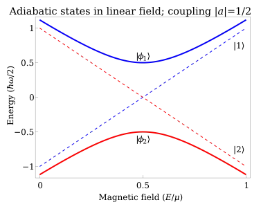 Study of a two-level system is of vital importance in quantum mechanics because it embodies simplification of many of physically realizable systems. The effect of perturbation on a two-state system Hamiltonian is manifested through avoided crossings in the plot of individual energy versus energy difference curve of the eigenstates.[3] The two-state Hamiltonian can be written as