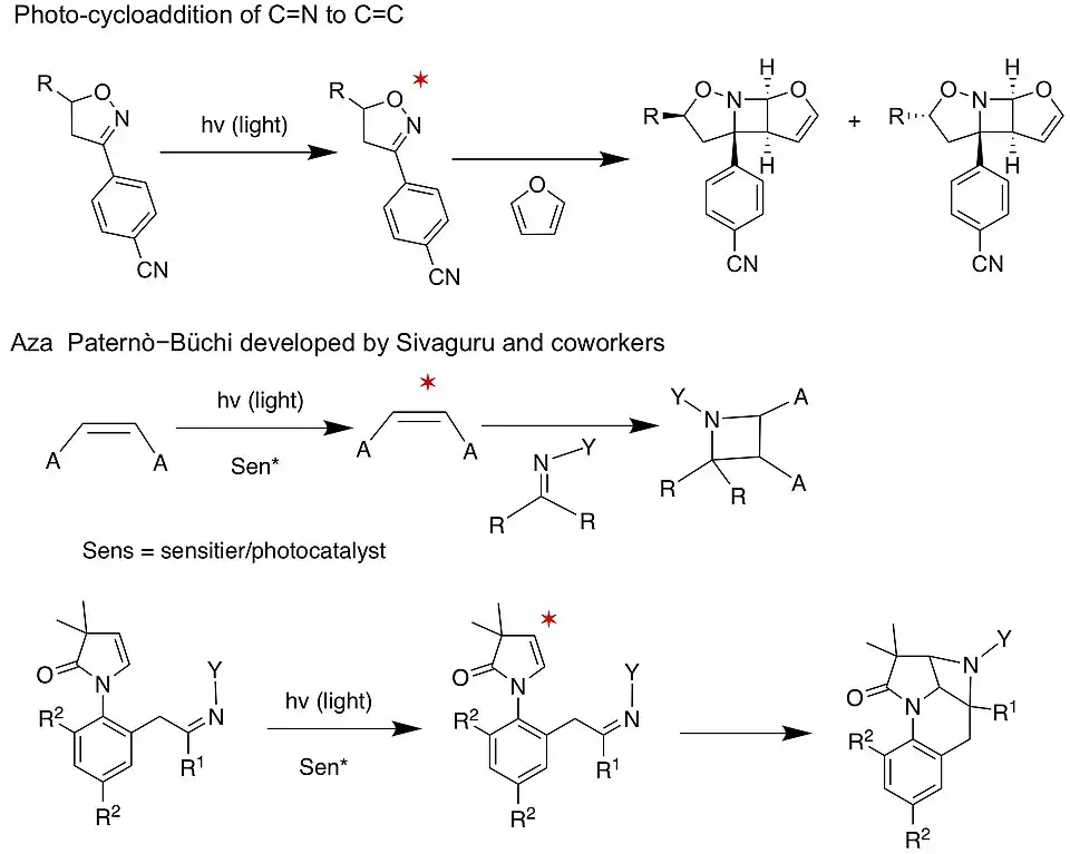 Aza Paternò−Büchi reaction involves an ππ* excited state of alkene reacting with a ground state imine. This strategy was developed by the laboratory Sivaguru and co-workers[1] to overcome the shortcomings involving direct excitation of imines. Traditionally addition of excited imines to carbon-carbon double bonds involves making the imines as part of a carbocycle.[2]