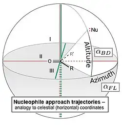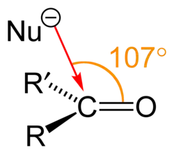 The Bürgi–Dunitz angle (BD angle) is one of two angles that fully define the geometry of "attack" (approach via collision) of a nucleophile on a trigonal unsaturated center in a molecule, originally the carbonyl center in an organic ketone, but now extending to aldehyde, ester, and amide carbonyls, and to alkenes (olefins) as well.[1][2][3] The angle was named after crystallographers Hans-Beat Bürgi and Jack D. Dunitz, its first senior investigators.