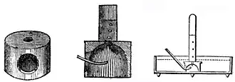 A beehive shelf is shown in the left-hand picture. The middle picture shows the shelf from the side with a gas entering from a tube on the left and bubbling up through a hole. The right-hand drawing is about half the scale of the others and shows the shelf in use inside a pneumatic trough.
