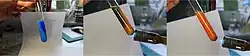 Benedict's reagent (often called Benedict's qualitative solution or Benedict's solution) is a chemical reagent and complex mixture of sodium carbonate, sodium citrate, and copper(II) sulfate pentahydrate.[1] It is often used in place of Fehling's solution to detect the presence of reducing sugars and other reducing substances.[2] Tests that use this reagent are called Benedict's tests. A positive result of Benedict's test is indicated by a color change from clear blue to brick-red with a precipitate.