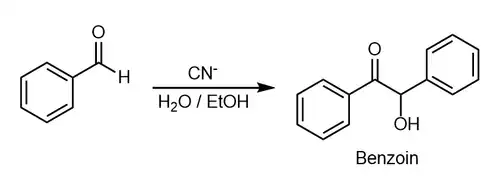 In organic chemistry, the benzoin addition is an addition reaction involving two aldehydes (−CH=O). The reaction generally occurs between aromatic aldehydes or glyoxals (OCH=CHO),[1][2] and results in formation of an acyloin (−C(O)CH(OH)−). In the classic example, benzaldehyde is converted to benzoin (PhCH(OH)C(O)Ph).[3]