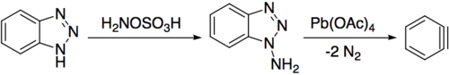 N-amination of 1H-benzotriazole with hydroxylamine-O-sulfonic acid generates an intermediate which can be oxidised to benzyne in almost quantitative yield with lead(IV) acetate.[17]