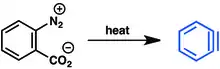 Such reactions require strong base and high temperatures. 1,2-Disubstituted arenes serve as precursors to benzynes under milder conditions. Benzyne is generated by the dehalogenation of 1-bromo-2-fluorobenzene by magnesium.[11] Anthranilic acid can be converted to 2-diazoniobenzene-1-carboxylate by diazotization and neutralization. Although explosive,[12] this zwitterionic species is a convenient and inexpensive precursor to benzyne.[13]