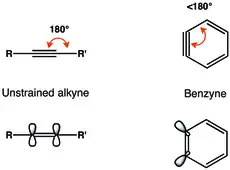 Geometric constraints on the triple bond in benzyne result in diminished overlap of in-plane p-orbitals, and thus weaker triple bond.[7] The vibrational frequency of the triple bond in benzyne was assigned by Radziszewski to be 1846 cm−1,[8] indicating a weaker triple bond than in unstrained alkyne with vibrational frequency of approximately 2150 cm−1. Nevertheless, benzyne is more like a strained alkyne than a diradical, as seen from the large singlet–triplet gap and alkyne-like reactivity.[3]