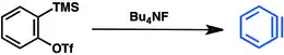 Another method is based on trimethylsilylaryl triflates.[14] This method has seen wide applicability and was reviewed in 2021.[15] Fluoride displacement of the trimethylsilyl group induces elimination of triflate and release of benzyne: