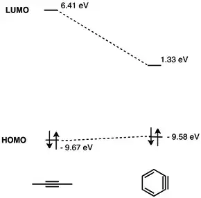 The LUMO of aryne lies much lower than the LUMO of unstrained alkynes, which makes it a better energy match for the HOMO of nucleophiles. Hence, benzyne possesses electrophilic character and undergoes reactions with nucleophiles.[9] A detailed MO analysis of benzyne was presented in 1968.[10]