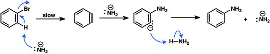 Upon treatment with basic nucleophiles, aryl halides deprotonate alpha to the leaving group, resulting in dehydrohalogenation. Isotope exchange studies indicate that for aryl fluorides and, sometimes, aryl chlorides, the elimination event proceeds in two steps, deprotonation, followed by expulsion of the nucleophile. Thus, the process is formally analogous to the E1cb mechanism of aliphatic compounds. Aryl bromides and iodides, on the other hand, generally appear to undergo elimination by a concerted syn-coplanar E2 mechanism.[18][19] The resulting benzyne forms addition products, usually by nucleophilic addition and protonation. Generation of the benzyne intermediate is the slow step in the reaction.[20]
