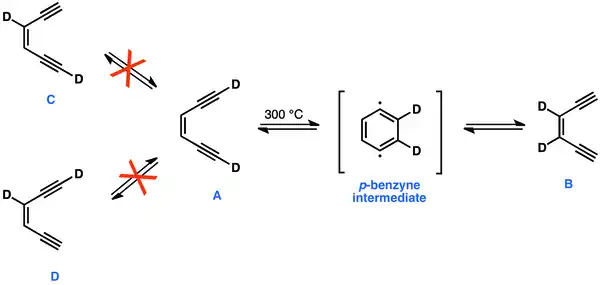 In classical 1,4-didehydrobenzene experiments, heating to 300 °C, [1,6-D2]-A readily equilibrates with [3,2-D2]-B, but does not equilibrate with C or D. The simultaneous migration of deuterium atoms to form B, and the fact that none of C or D is formed can only be explained by a presence of a cyclic and symmetrical intermediate–1,4-didehydrobenzene.[36]