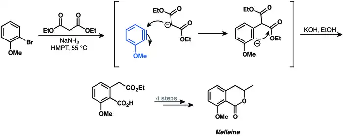The first example of aryne σ-bond insertion reaction is the synthesis of melleine in 1973.[33]
