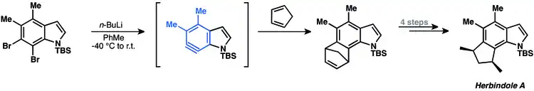 [4+2] cycloadditions of arynes have been commonly applied to natural product total synthesis. The main limitation of such approach, however, is the need to use constrained dienes, such as furan and cyclopentadiene.[14] In 2009 Buszek and co-workers synthesized herbindole A using aryne [4+2]-cycloaddition.[29] 6,7-indolyne undergoes [4+2] cycloaddition with cyclopentadiene to afford complex tetracyclic product.