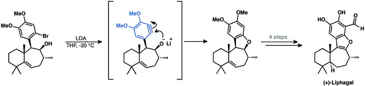 The synthesis of the tetracyclic meroterpenoid (+)-liphagal involved an aryne intermediate.[54] Their approach employed an aryne cyclization to close the final ring of the natural product.[14]