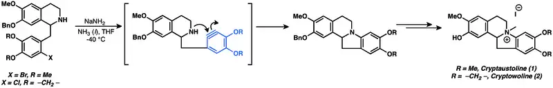 A variety of natural products have been prepared using arynes as intermediates.[14] Nucleophilic additions to arynes have been widely used in natural product total synthesis. Indeed, nucleophilic additions of arynes are some of the oldest known applications of aryne chemistry.[14] Nucleophilic addition to aryne was used in the attempted synthesis of cryptaustoline (1) and cryptowoline (2).[53]