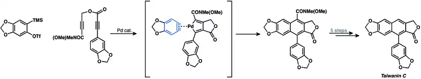 Mori and co-workers performed a palladium-catalyzed [2+2+2]-cocyclization of aryne and diyne in their total synthesis of taiwanins C.[32]