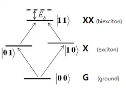 where is the binding energy of the biexciton and is the energy of exciton.[5]