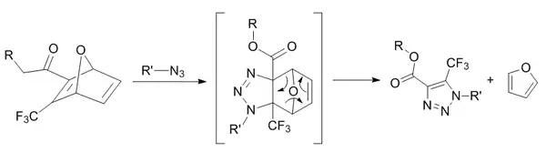 Ring strain and electron deficiency in the oxanorbornadiene increase reactivity towards the cycloaddition rate-limiting step. The retro-Diels Alder reaction occurs quickly afterwards to form the stable 1,2,3 triazole. Problems include poor tolerance for substituents which may change electronics of the oxanorbornadiene and low rates (second order rate constants on the order of 10−4).