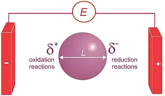 Bipolar electrochemistry is a phenomenon in electrochemistry based on the polarization of conducting objects in electric fields. Indeed, this polarization generates a potential difference between the two extremities of the substrate that is equal to the electric field value multiplied by the size of the object. If this potential difference is important enough, then redox reactions can be generated at the extremities of the object, oxidations will occur at one extremity coupled simultaneously to reductions at the other extremity.[1][2] In a simple experimental setup consisting of a platinum wire in a weighing boat containing a pH indicator solution, a 30 V voltage across two electrodes will cause water reduction at one end of the wire (the cathode) and a pH increase (OH− formation) and water oxidation at the anodic end and a pH decrease. The poles of the bipolar electrode also align themselves with the applied electric field.[3]
