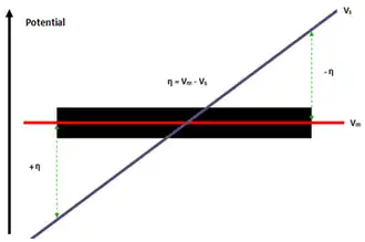 The potential difference (η) between the electrically conductive electrode (Vm) and the electrolyte (Vs) causes a potential gradient which is distributed latterly across the BPE-electrolyte interface, with one extreme having the highest potential (anode +η) and the other extreme having the lowest potential (cathode -η).[5] Comparing to the electrolyte potential (Vs) gradient/drop; the electrode potential (Vm) does not change between the BPE poles, this is due to the high conductivity of the electrodes which is higher than 106 S/m for most of steel alloys, compared to the solution conductivity in the range of 5.5 μS/m for ionized water and 5 S/m for seawater.[5]
