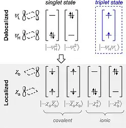Consequently, the singlet wavefunction can be expressed as the combination of a covalent contribution and an ionic contribution . The covalent component represents the electron configuration in which both localized orbitals are singly occupied; this corresponds to diradical character. The ionic component represents the electron configuration in which one localized orbital is doubly occupied, leaving the other localized orbital empty; this corresponds to zwitterionic character: