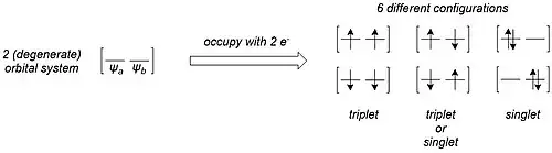 The triplet state wavefunction can be described as a single electronic configuration with a single Slater determinant. However, when the frontier molecular orbitals are degenerate or nearly degenerate, the lowest-energy singlet state wavefunction must account for multiple electronic configurations (see electronic correlation). Thus, is most accurately represented as a combination of Slater determinants. Here, the configuration interaction (CI) coefficients and define the contribution of each determinant to the total wavefunction, where refers to the HOMO and refers to the LUMO: