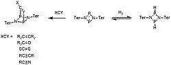 For example, the phosphorus-centered diradicaloid [P(μ-NTer)2]2 can undergo concerted pericyclic reactions with single bonds (H2), double bonds (alkenes, aldehydes), and triple bonds (alkynes, nitriles) (Figure 15).[3] Only the cis-addition products are observed, which is consistent with a concerted mechanism.