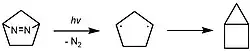 Cyclopentane-1,3-diyl is the planar five-membered carbon ring species with radical character localized at the 1 and 3 positions. The triplet diradical was detected by EPR spectroscopy; the diradical species was generated via irradiation of the precursor diazo compound at 5.5 K in a solid matrix (Figure 11).[39][40] Due to its very short lifetime, all-carbon cyclopentane-1,3-diyl cannot be isolated, but heating cyclopentane-1,3-diyl leads to the formation of a transannular C-C bond, producing the housane isomer. While the triplet state is predicted to be an energy minimum, the singlet state is predicted to be the transition state for housane inversion.[41]