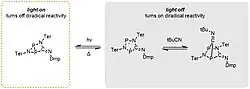 For example, the concept of switchable diradicals was demonstrated using the hetero-cyclopentane-1,3-diyl with phosphorus-phosphorus centered radicals (Figure 19).[11] Upon exposure to red light, the planar five-membered ring diradical isomerizes to the bicyclic housane species. After irradiation, the thermally induced reverse reaction occurs, breaking the transannular bond to regenerate the planar diradicaloid species. Thus, the activation chemistry of the diradical can be switched "off" via irradiation and can be switched back "on" via stopping irradiation. This switching could be repeated several times without degradation of the diradicaloid.