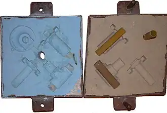 Front side of a four family die. For reference, the die is 228 mm (9.0 in) in diameter.