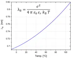 The relative permittivity εr of water decreases so strongly with temperature that the product (εr·T) decreases. Therefore, in spite of the (1/T) relation, the Bjerrum length λB increases with temperature, as shown in the graph.