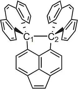 Another notable compound with an extraordinary C-C bond length is tricyclobutabenzene, in which a bond length of 160 pm is reported. Longest C-C bond within the cyclobutabenzene category is 174 pm based on X-ray crystallography.[3] In this type of compound the cyclobutane ring would force 90° angles on the carbon atoms connected to the benzene ring where they ordinarily have angles of 120°.