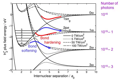 Bond hardening and bond softening share the same theoretical basis, which is described under the latter entry. Briefly, the ground and the first excited energy curves of the H2+ ion are dressed in photons. The laser field perturbs the curves and turns their crossings into anticrossings. Bond softening occurs on the lower branches of the anticrossings and bond hardening happens if the molecule is excited to the upper branches – see Fig. 1.