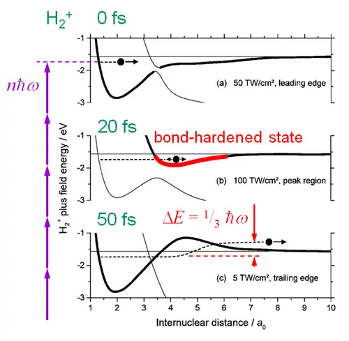 In a few femtoseconds it takes the wave packet to cross the potential well, the laser intensity is still modest and the 3-photon gap is small allowing the wave packet to cross it diabatically. At large internuclear separations, the gentle slope of the potential well slowly turns the wave packet back, so when the packet returns to the 3-photon gap, the laser intensity is significantly higher and the gap is wide open trapping the wave packet in a bond-hardened state, which lasts throughout the highest intensities (Fig. 3b).