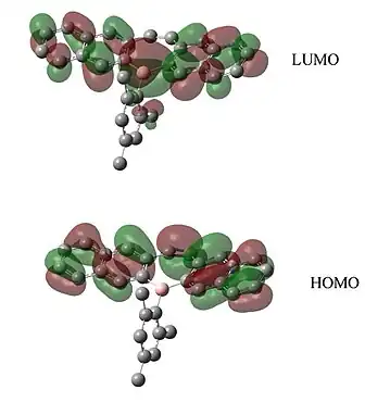HOMO/LUMO electronic density mapping. Carbon atoms are in grey while the boron atom is pink/red in the center of the image.[5]